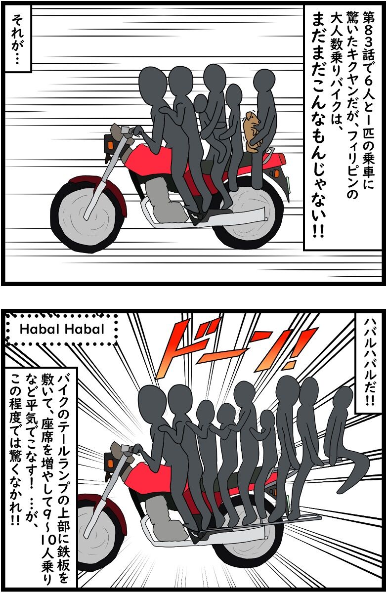 November 26, 2021 第一章・第84話 驚愕!ハバルハバル ハバルハバルは本当に、ある意味でフィリピンバイクの闇ですね…もう、小型バイクに無茶させ過ぎ!(笑)でも、こういうの大好きです(笑)ウチのオフィススタッフが言ってたんですが、2コマ目タイプのハバルハバルが転倒すると、一番後ろの人以外身動き取れないからなすすべなく一緒に倒れるそうで、一番後ろだけは割と回避できるし、一番後ろだけ少し座りやすいから人気らしいです(笑)確かに、私もこれのどこ座るか選べるなら、間違いなく一番後ろを選びます。真ん中とか絶対イヤ(笑)
